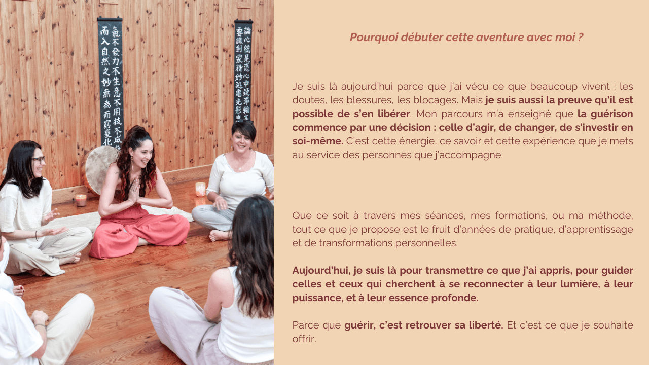 Ensemble, nous bâtirons les bases solides de ton rôle de facilitatrice, pour que tu puisses à t tour devenir une source de lumière et d’inspiration.